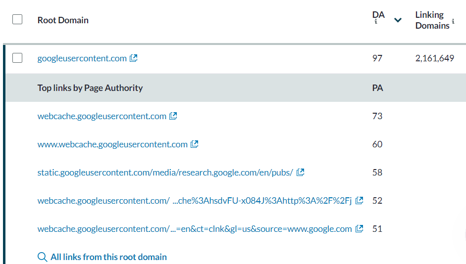 I  have just encountered an interesting thing about Moz Link Search and its bot: if you do a search for Domains linking to Google.com , you find a  list of about 900 000 domains, among which I was surprised  to find  webcache.googleusercontent.com